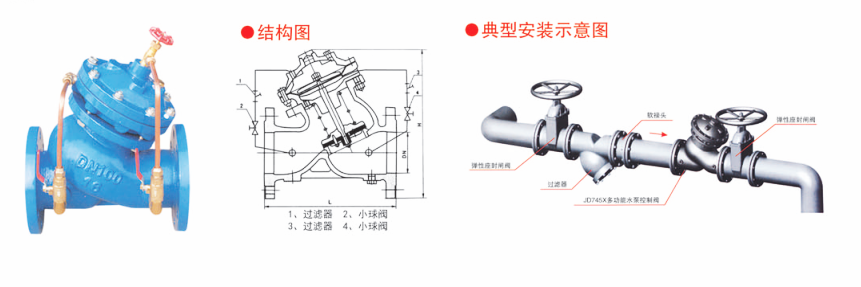 JD745X多功能水泵控制阀是安装在高层建筑给水系统以及其他给水系统的水泵出口处、防止介质倒流、水锤及水击现象的智能型阀门。该JD745X多功能水泵控制阀兼具电动阀、逆止阀和水锤消除器三种功能,可有效地提高供水系统的安全可靠性。并将缓开、速闭、缓闭消除水锤的技术原理一体化,防止开泵水锤和停泵水锤的产生。只需操作水泵电机启闭按扭,JD745X多功能水泵控制阀门即可按照水泵操作规程自动实现启闭,流量大、压力损失小,隔膜式适用于6O0口径以下的阀门。
